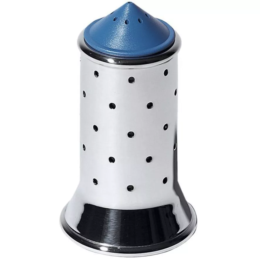 Het Michael Graves zoutvaatje van Alessi is gemaakt van roestvrij staal en kunststof en is verkrijgbaar in drie kleuren: zwart, wit en blauw. Dit product heeft een diameter van 6,3 centimeter en een hoogte van 11,3 centimeter.