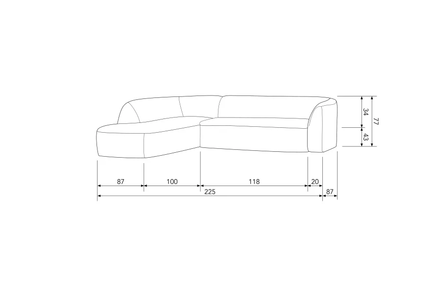 De Sloping hoekbank links van BePureHome is 274 centimeter breed, 87 centimeter diep, 225 centimeter diep op de hoek en 77 centimeter hoog. De hoekbank is gemaakt van FSC-gecertificeerd massief hout, spaanplaat, polyurethaan schuim en een zigzag vering. De zitting bevat polyurethaan schuim. De stof is gemaakt van 100% polyester chenille. De bank scoort 38.000 op de schaal van Martindale en is dus geschikt voor normaal woongebruik. De hoekbank is verkrijgbaar in verschillende kleuren die allemaal een duidelijk weefpatroon in de stof hebben.