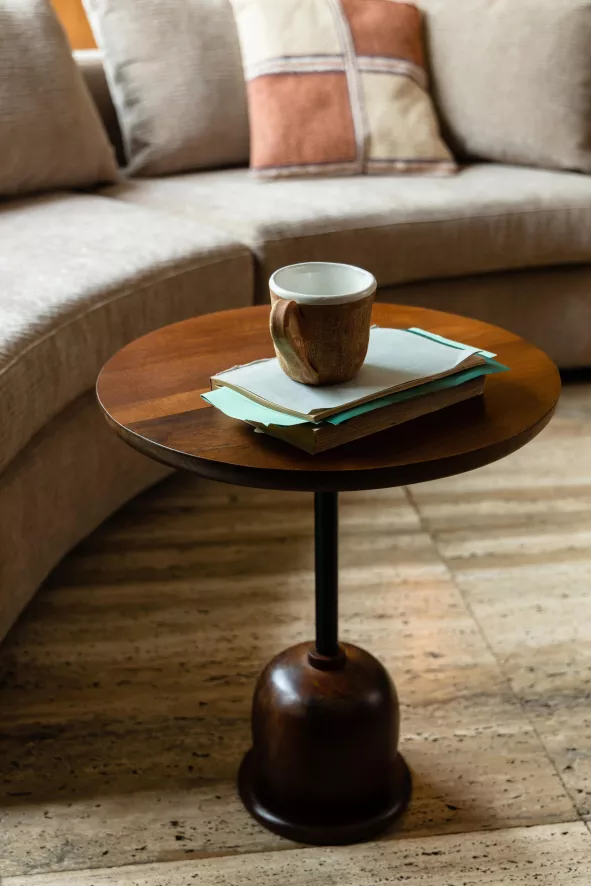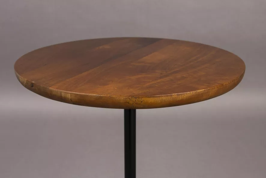 De Hazel bijzettafel van Dutchbone heeft een diameter van 45 centimeter, een hoogte van 50 centimeter en een gewicht van 6,9 kilogram. De ronde bijzettafel is gemaakt van massief mangohout. De tafelpoot is gemaakt van metaal en is afgewerkt met een zwarte poedercoating.