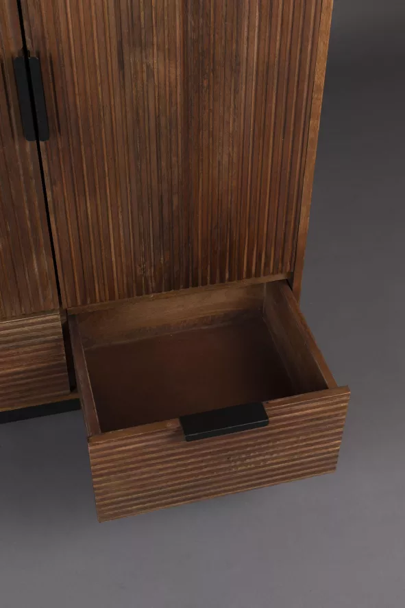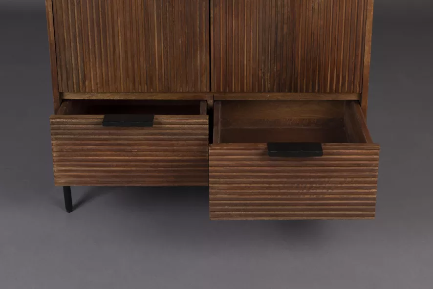 De Saroo opbergkast M van Dutchbone is 80 centimeter breed, 40 centimeter diep en 115 centimeter hoog. Saroo heeft twee kastdeuren, twee lades en een plank met een breedte van 76,5 centimeter en een diepte van 34 centimeter. De kast is gemaakt van massief mangohout met een lichte honingkleurige finish, de achterkant van MDF. Saroo heeft een zwart gepoedercoated ijzeren frame. Het maximale draaggewicht van Saroo bedraagt 55 kilogram.