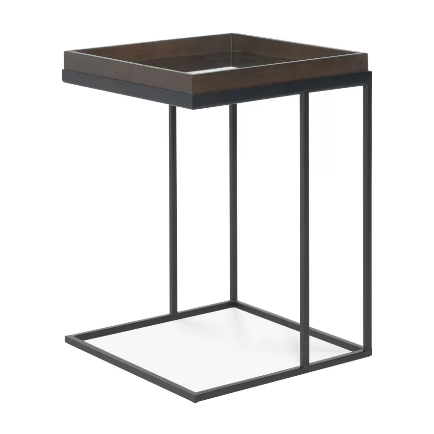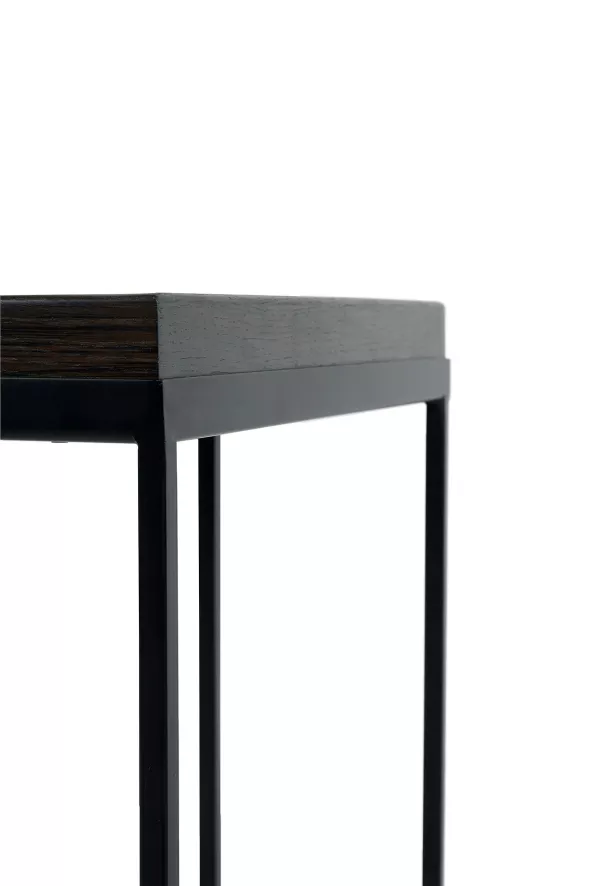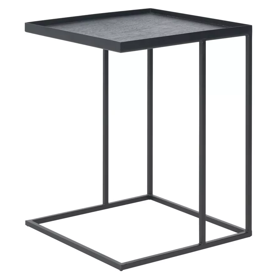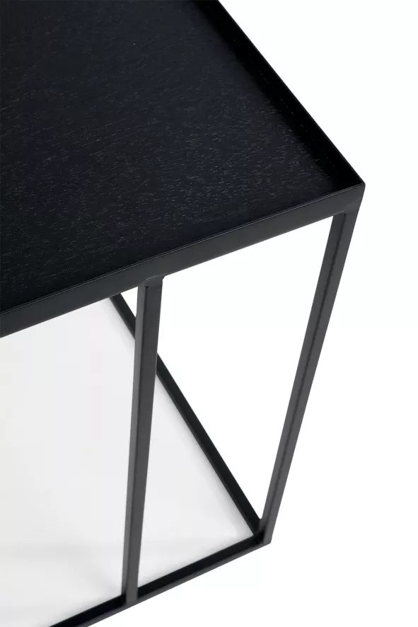 De Tray square bijzettafel S 39×39 van Ethnicraft heeft een lengte van 39 centimeter, een breedte van 40 centimeter en een hoogte van 50 centimeter. De bijzettafel heeft een metalen frame dat met een zwarte poedercoat is afgewerkt en een houten tafelblad dat met een zwarte lak op waterbasis behandeld is. Het tafelblad is voorzien van een kleine, opstaande rand.