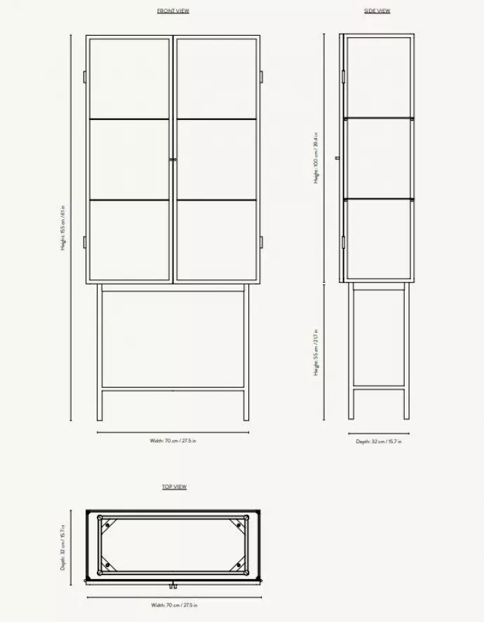 De Haze vitrinekast heeft een frame gemaakt van zwart gepoedercoat metaal en twee glazen deuren. De kast heeft een hoogte van 155 centimeter, een breedte van 70 centimeter en een diepte van 32 centimeter. In de kast bevinden zich twee metalen planken. Reinig de Haze vitrinekast met een licht vochtige doek. De Haze serie is ontworden door Nikolaj Duve en Kasper Meldgaard van Says Who.