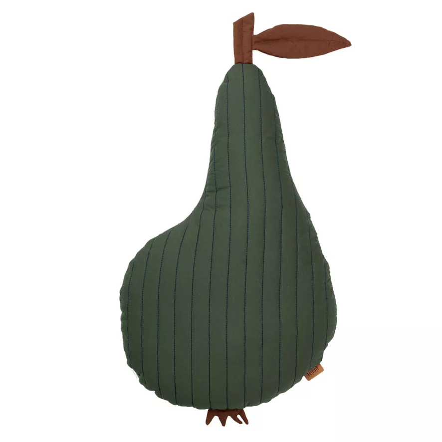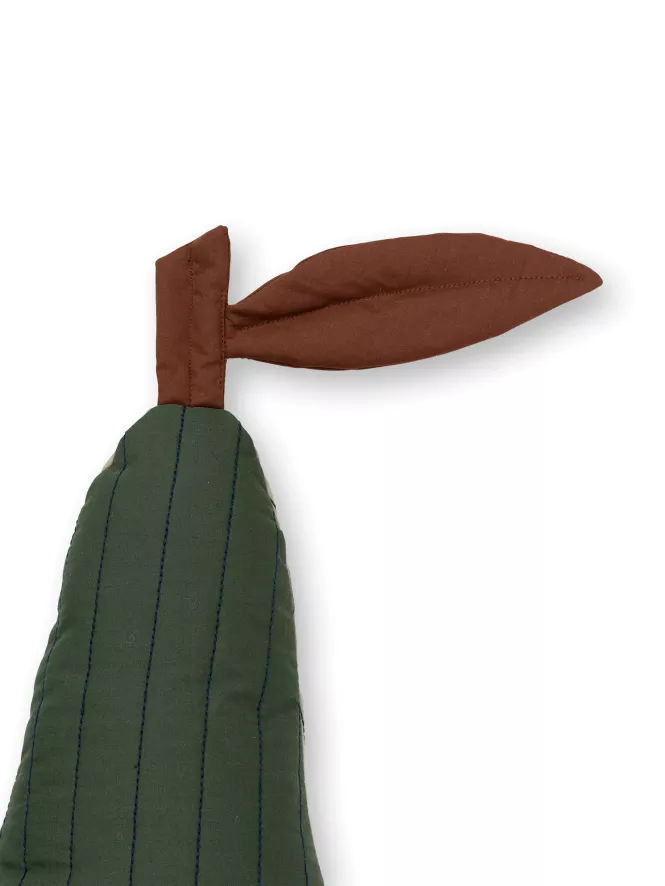 Het Pear Quilted kussen van Ferm Living heeft een breedte van 33 centimeter, een hoogte van 59 centimeter en een diepte van 15 centimeter. Het kussen is bekleed met een 100% GOTS-gecertificeerd katoenen stof en gevuld met 100% gerecycled polyester. Ferm Living raadt aan het kussentje op een zacht wasje op maximaal 30°C graden te wassen. Pear is ook verkrijgbaar als Apple.