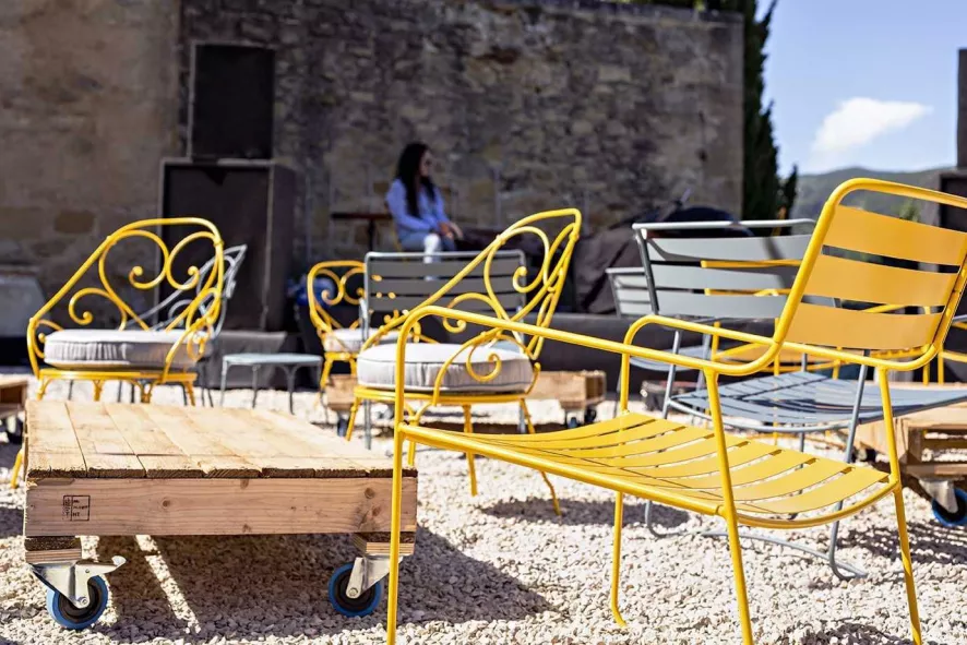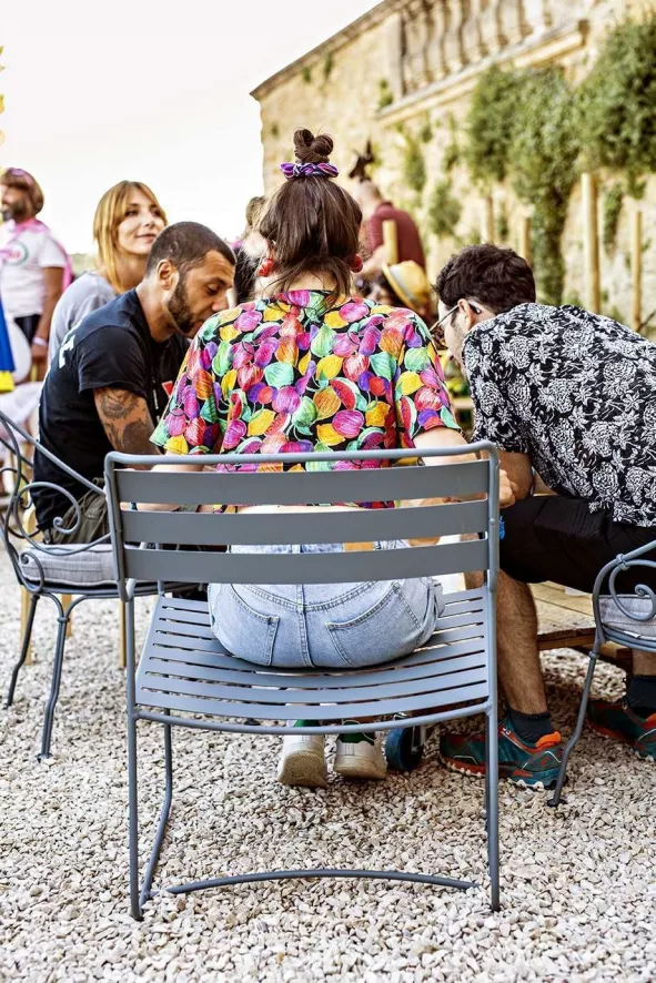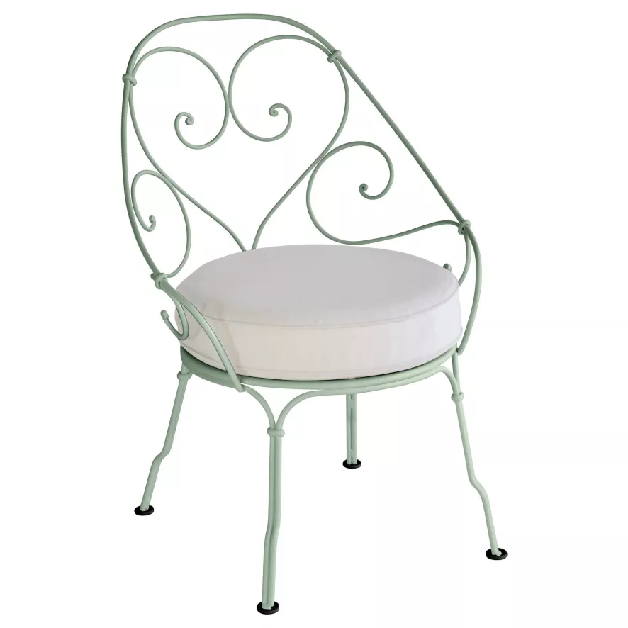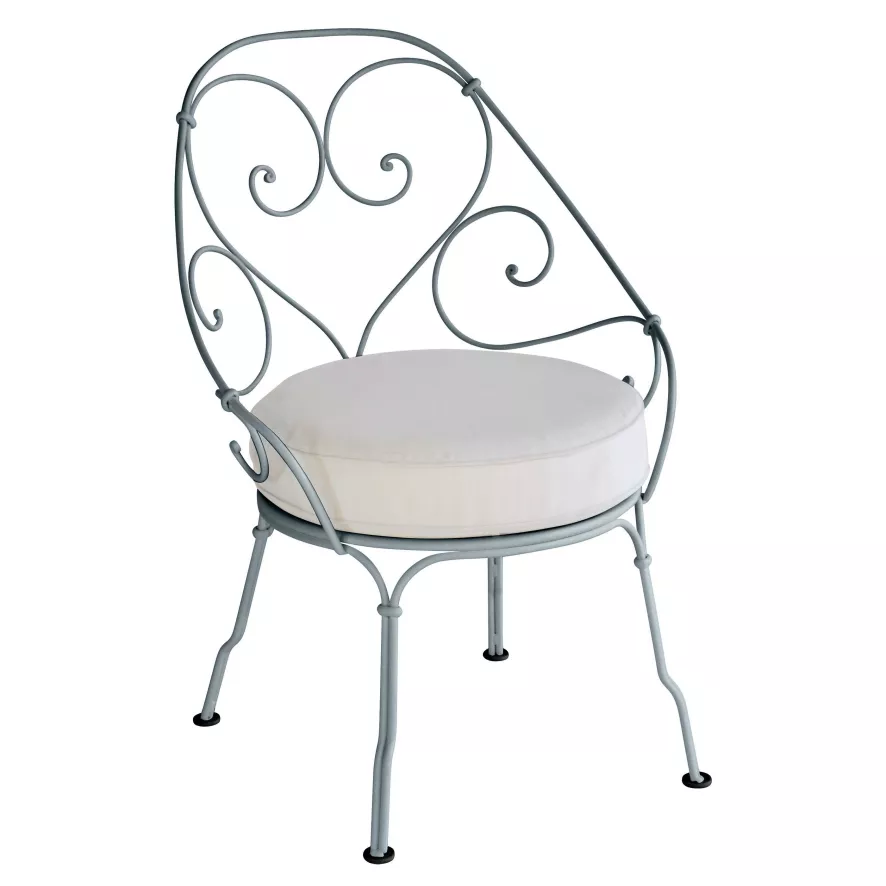 Dit is het Fermob 1900 fauteuil met off-white zitkussen.