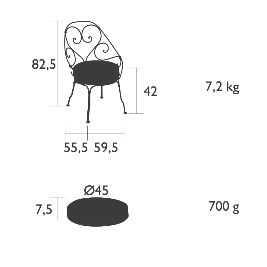 De 1900 fauteuil van Fermob heeft een hoogte van 82,5 centimeter, een breedte van 59,5 centimeter en een diepte van 55,5 centimeter. De romantische stoel heeft een stalen staaf basis die met de hand is gesmeed en een zitkussen dat bestand is tegen verschillende weersomstandigheden. De 1900 fauteuil is verkrijgbaar in verschillende kleuren en heeft een anti-UV poeder laag. Als het design van deze fauteuil je aanspreekt, bekijk dan ook zeker de andere 1900 tuinmeubelen van Fermob.