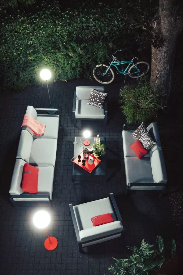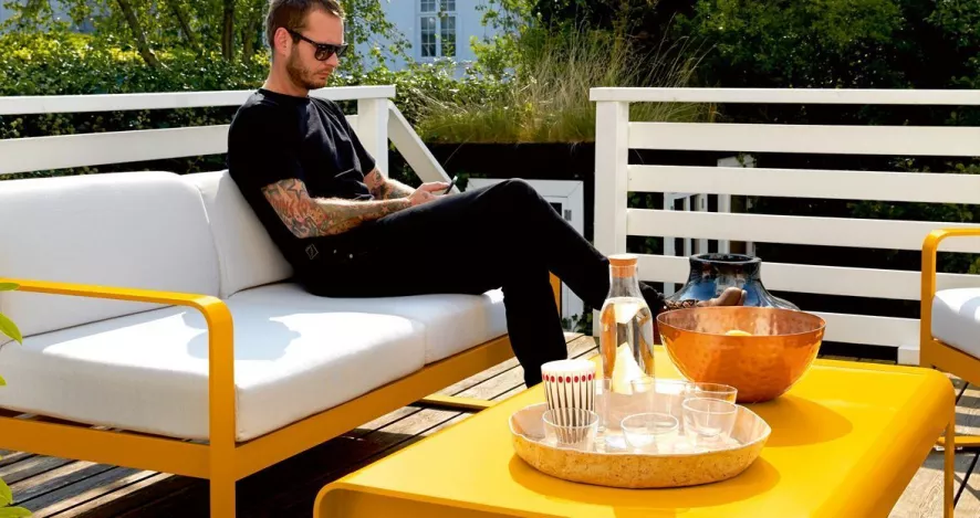 Het Fermob Bellevie bijzettafel buiten is ontworpen door Pagnon Pelhaître.