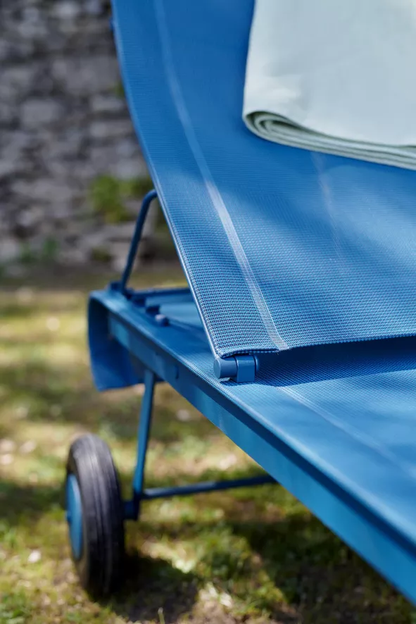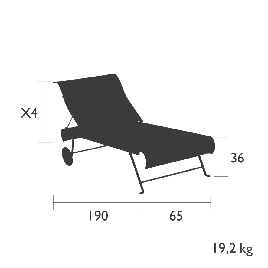 De Dune ligstoel van van Fermob is 65 centimeter breed en 190 centimeter lang. De stoel weegt 19,2 kilogram en is gemaakt van staal. De rug is verstelbaar op 64, 80, 90 en 97 centimeter en er zijn twee wielen met elk een diameter van 20 centimeter. De Dune ligstoel is scheurvast, bestand tegen vlekken, schimmel en vervorming.