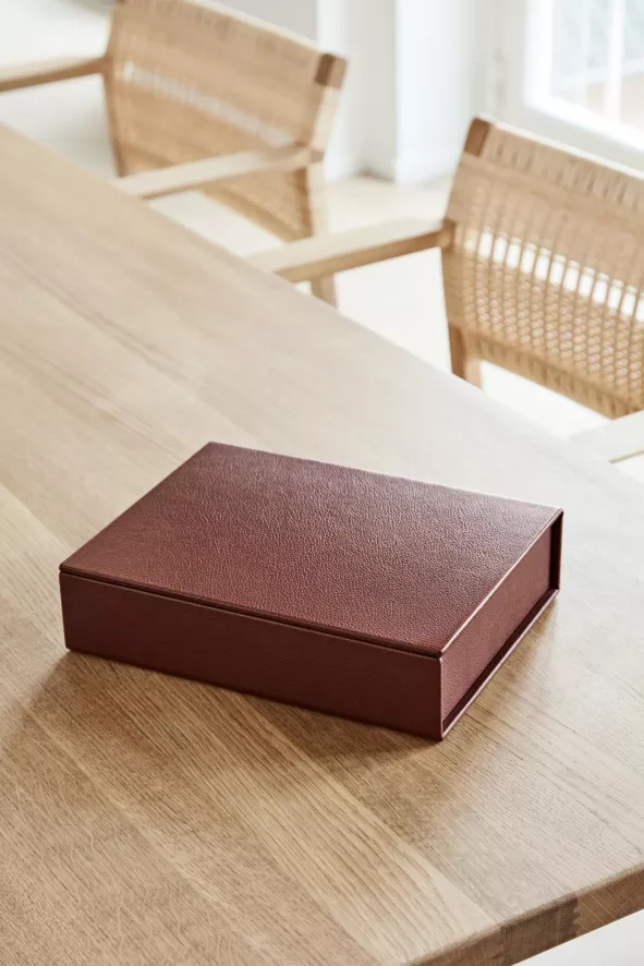 De Leather Box opberger van Fredericia heeft een breedte van 27 centimeter, een diepte van 21 centimeter en een hoogte van 7 centimeter. Deze opberger is gemaakt van restanten leerbekleding uit de Fredericia bekleding werkplaats.