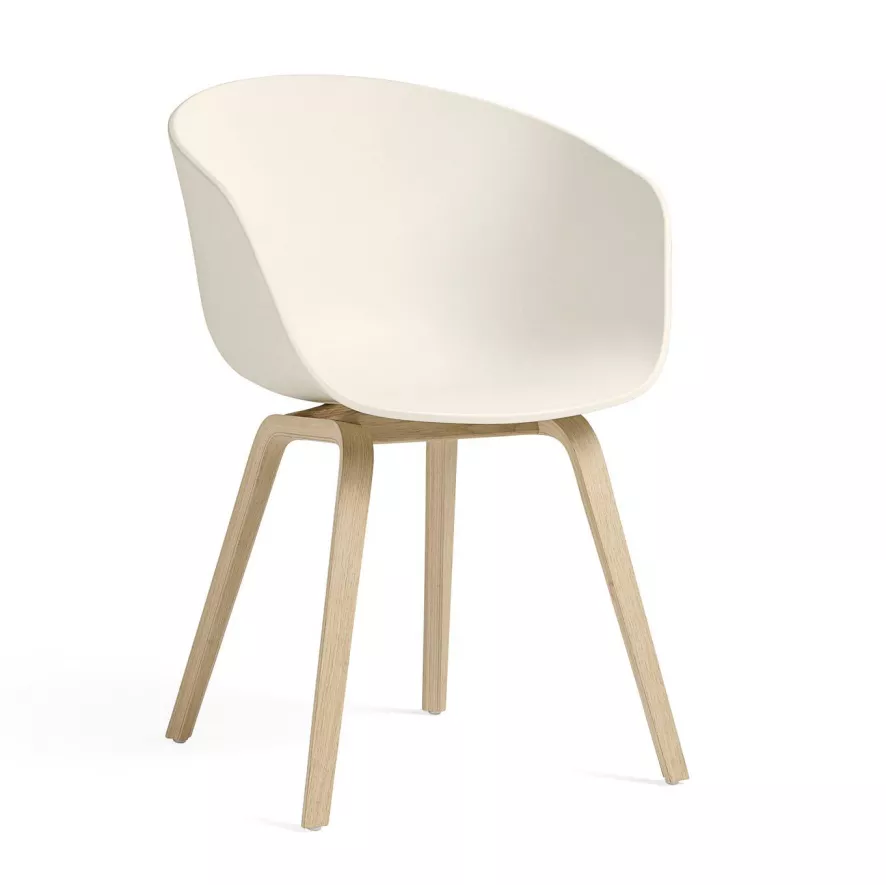 De stoel heeft een breedte van 59 centimeter, een diepte van 52 centimeter en een hoogte van 79 centimeter. De stoel heeft een zithoogte van 46 centimeter en een zitdiepte van 40 centimeter. Deze stoel heeft een vierpotig onderstel van eikenhout dat met een lak op waterbasis is afgewerkt. Het onderstel is voorzien van standaard, plastic vloerbeschermers. De zitkuip van de stoel is gemaakt van 100% gerecycled plastic en heeft een effen kleur. De About a Chair AAC22 stoel met gelakt onderstel van Hay is in verschillende uitvoeringen verkrijgbaar.