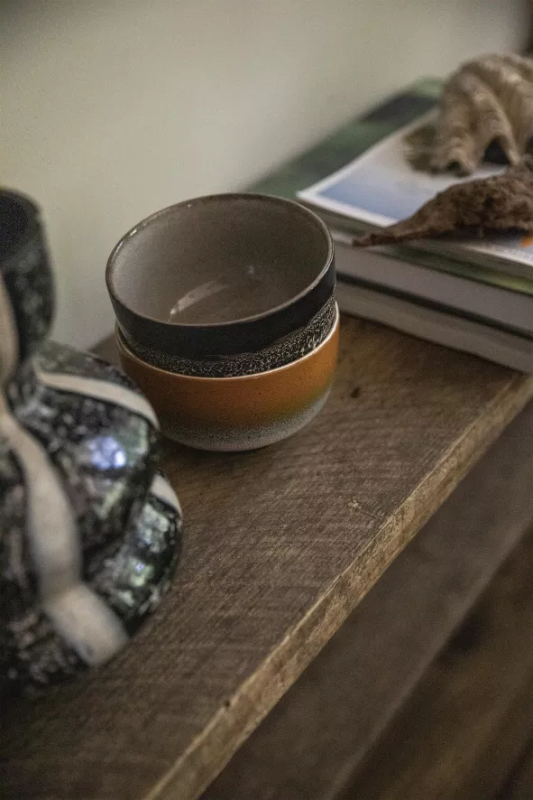 De 70’s Ceramic noodle schaal set van 4 van HKliving bestaat uit vier schalen. Elke schaal heeft een diameter van 13,5 centimeter en is 8 centimeter hoog. Er kan 500 milliliter in de schaal. De schalen zijn gemaakt van keramiek met een glazuurlaag en zijn vaatwasser-, voedsel- en magnetronbestendig. Deze 70’s-collectie is geïnspireerd op de jaren zeventig en zijn stuk voor stuk handgemaakt. Daardoor is elk item uniek en heeft het een eigen karakter. De 70’s Ceramic noodle schaal set van 4 is ook verkrijgbaar in andere maten, bekijk de hele 70’s collectie.