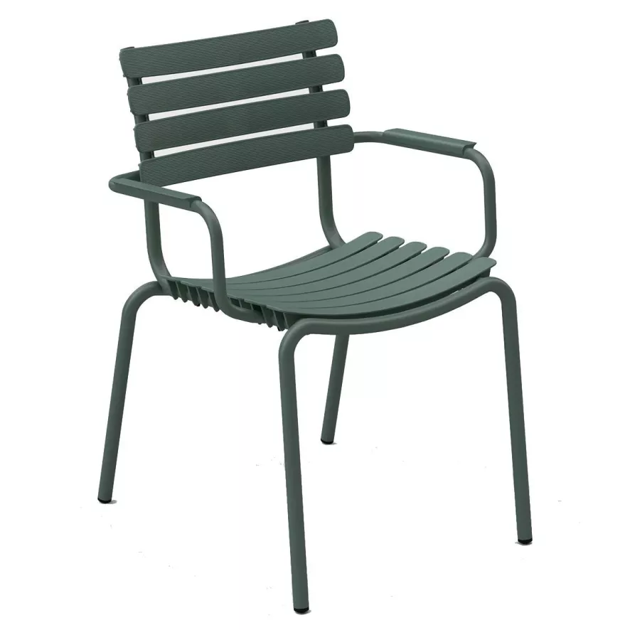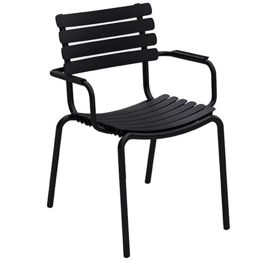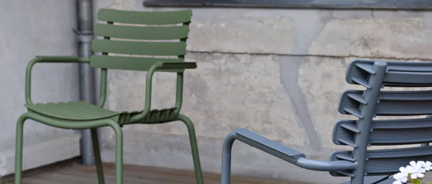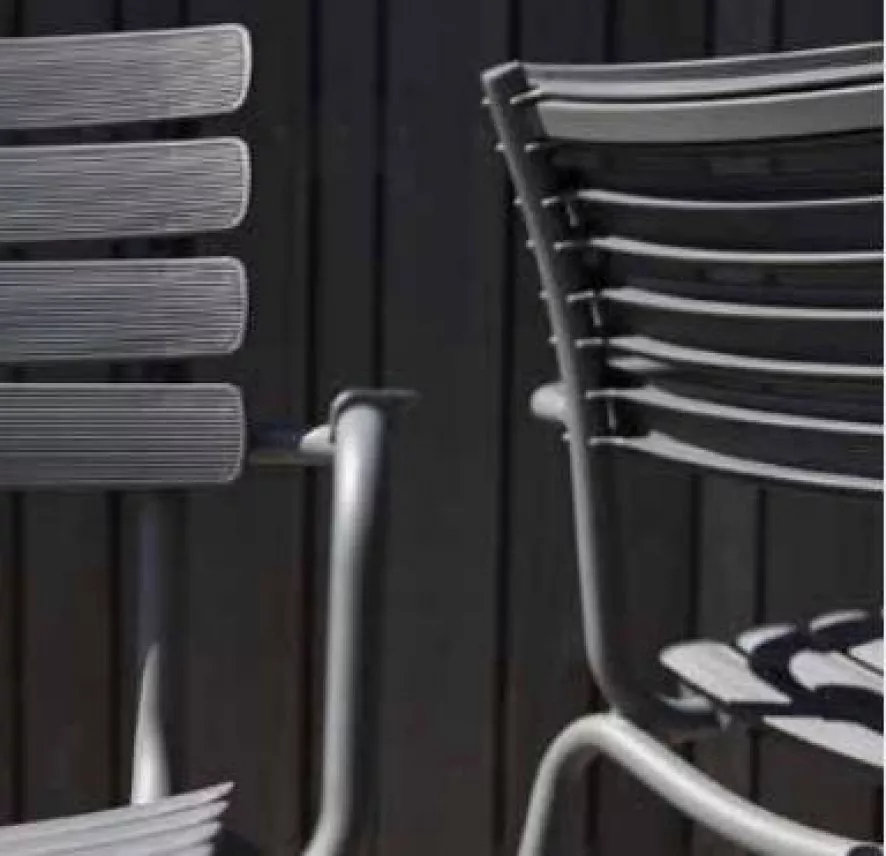 De ReClips tuinstoel met armleuningen, ontworpen door Henrik Pedersen, van HOUE heeft een hoogte van 81 centimeter, een diepte van 58 centimeter en een breedte van 61 centimeter. De zithoogte bedraagt 47 centimeter. Het frame van ReClips is gemaakt van gepoedercoated aluminium. De lamellen worden voor 97% van huishoudelijk plastic afval gemaakt en zijn bewerkt met een Uv-bestendige coating. De tuinstoelen hebben minimaal onderhoud nodig. HOUE raadt aan het aluminium te reinigen met water en milde zeep. ReClips is opstapelbaar en verkrijgbaar in verschillende stijlvolle kleuren.