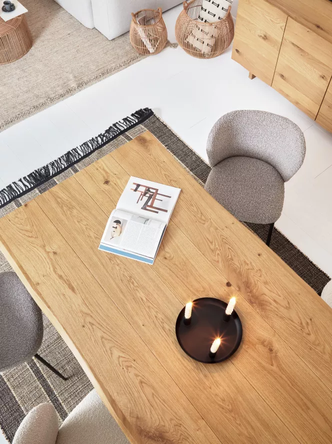 De Ciselia stoel van Kave Home heeft een breedte van 55 centimeter, een diepte van 52 centimeter en een hoogte van 75 centimeter. De stoel heeft een zithoogte van 49 centimeter, een zitbreedte van 45 centimeter en een zitdiepte van 43 centimeter. De rugleuning van de stoel heeft een hoogte van 32 centimeter en een breedte van 52 centimeter. Deze stoel heeft een stalen, vierpotig onderstel dat met een zwarte poedercoat afgewerkt is. Het onderstel is voorzien van plastic vloerbeschermers. De zitkuip is gemaakt van triplex en schuim en is volledig bekleed in schapenvachtachtige Shearling stof. Deze stof bestaat voor 95% uit polyester en voor 5% uit acrylvezels. De Shearling stof scoort 80.000 op de slijtproef van Martindale en is daarmee geschikt voor intensief woongebruik. Verder scoort de stof een 4 (heel goed) op weerstand tegen pluis en scoort het een 5 (goed) op kleurechtheid. De Ciselia stoel van Kave Home heeft een gewicht van 5,7 kilogram en is in verschillende uitvoeringen verkrijgbaar.