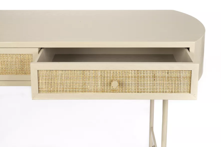 De Tuni sidetable van Livingstone Design heeft een lengte van 120 centimeter, een breedte van 40 centimeter en een hoogte van 76 centimeter. Deze sidetable heeft een frame van staal dat met een poedercoat is afgewerkt. De tafel met de twee lades zijn gemaakt van gelakt MDF en hebben deurtjes die ingelegd zijn met rattan. De Tuni sidetable van Livingstone Design is alleen geschikt voor gebruik binnenshuis en is in verschillende uitvoeringen verkrijgbaar.