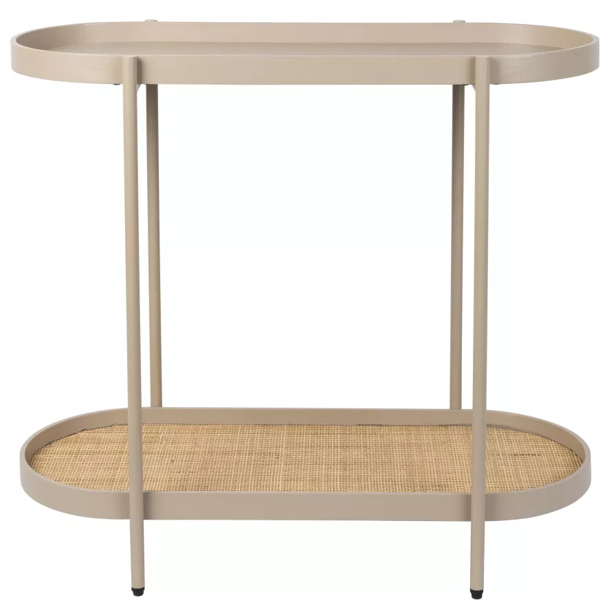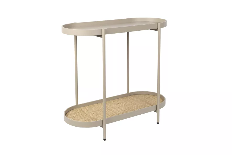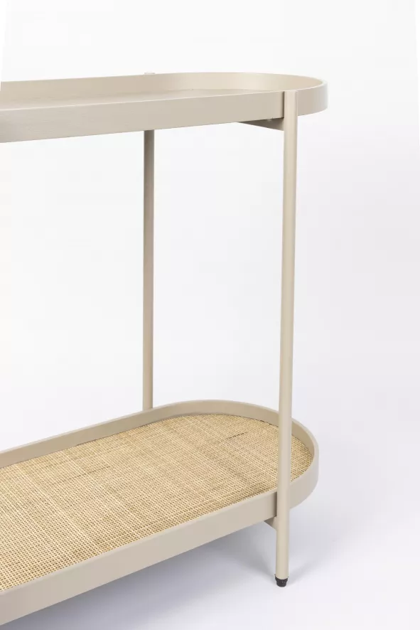 De Tuni sidetable van Livingstone Design heeft een lengte van 85 centimeter, een breedte van 39 centimeter en een hoogte van 76 centimeter. Deze sidetable heeft een frame van staal dat met een poedercoat is afgewerkt. De twee tafelbladen zijn gemaakt van gelakt MDF en zijn ingelegd met rattan. Deze consoletafel heeft een gewicht van 7,5 kilogram. De Tuni sidetable van Livingstone Design is alleen geschikt voor gebruik binnenshuis en is in verschillende uitvoeringen verkrijgbaar.