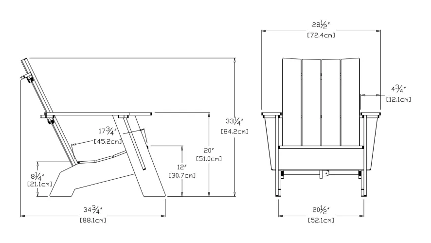De Adirondack fauteuil van Loll Designs heeft een breedte van 72,4 centimeter, een diepte van 88,1 centimeter en een hoogte van 84,2 centimeter. De zithoogte bedraagt 30,7 centimeter, de zitdiepte 45,2 centimeter en de zitbreedte 52,1 centimeter. De fauteuil is volledig gemaakt van hergebruikt HDPE (plastic) en weegt 17,7 kilogram. Loll Designs is Cradle to Cradle-gecertificeerd. De fauteuil kan worden gereinigd met wat water en een sopje. Adirondack is verkrijgbaar in verschillende kleuren.
