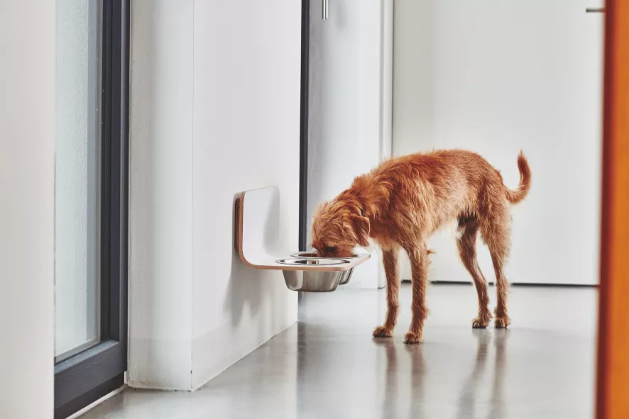 De Acro hondenvoerbak wand small/medium van MiaCara is 35,2 centimeter lang, 21,7 centimeter breed en 15 centimeter hoog. De twee roestvrijstalen kommen hebben elk een inhoud van 0,4 liter en hebben een binnendiameter van 12 centimeter. De Arco hondenvoerbak wand small/medium is gemaakt van gebogen multiplex met een coating van hogedruklaminaat en kan afgenomen worden met een zacht doekje. De wand is verkrijgbaar in twee kleuren. De twee kommen zijn gemaakt van geborsteld roestvrijstaal en zijn geschikt voor de vaatwasser.