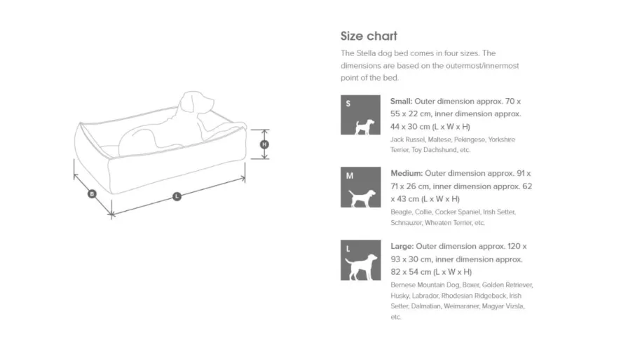 De MiaCara Stella hondenmand large is 120 centimeter breed, 93 centimeter diep en 30 centimeter hoog. Dat maakt het hondenkussen geschikt voor grote honden zoals Berner Sennenhond, Boxer of een Golden Retriever. De mand is 60% gemaakt van katoen en 40% van polyester. De vulling van de mand is 100% gemaakt van polyurethaanschuim. Dat betekent dat de hondenmand stabiel, duurzaam, hypoallergeen en permanent elastisch is. De mand en hoes kunnen worden gewassen tot 60ºC. Het matras kan worden gewassen tot 30 ºC. Er wordt echter aangeraden om géén gebruik te maken van gechloreerde en chemisch agressieve wasproducten. De MiaCara Stella hondenmand is verkrijgbaar in verschillende kleuren en formaten.