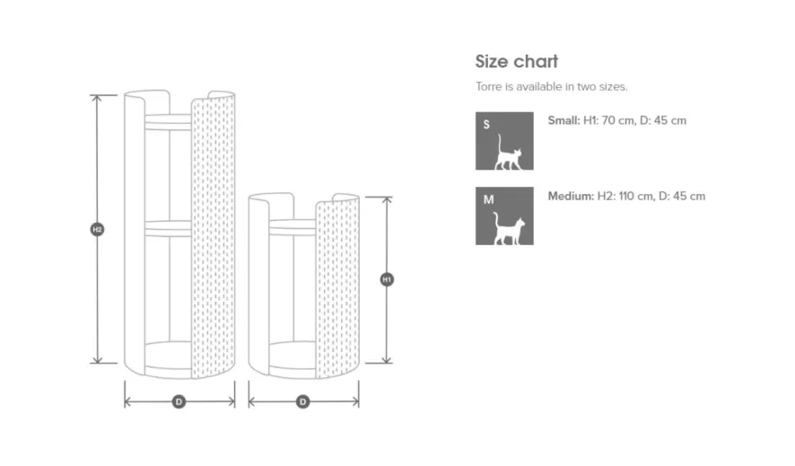 De Torre krabpaal is ontworpen door Regina Mol. De Torre krabpaal small is 70 centimeter hoog en heeft een diamtere van 45 centimeter. De zijpanelen zijn van gebogen multiplex en de platvormen van MDF, beide zijn voorzien van een essenhout fineer. Een van de zijpanelen is helemaal bedekt met designvilt waar de kat eindeloos aan kan krabben. De krabpaal is verkrijgbaar in verschillende formaten en kleuren.