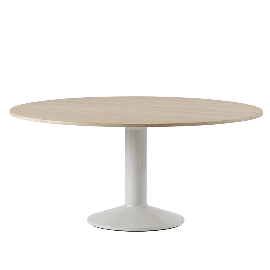 De Midst eettafel 160 van Muuto heeft een diameter van 160 centimeter en een hoogte van 73 centimeter. De tafel heeft een onderstel van staal en is met een poedercoat afgewerkt. Het tafelblad is verkrijgbaar in een eikenhouten en een linoleum uitvoering. Beide varianten zijn in diverse kleuren en afwerkingen verkrijgbaar. Deze eettafel is geschikt voor 8 personen en mag alleen binnenshuis gebruikt worden. De Midst eettafel 160 van Muuto is in verschillende kleuren en formaten verkrijgbaar.