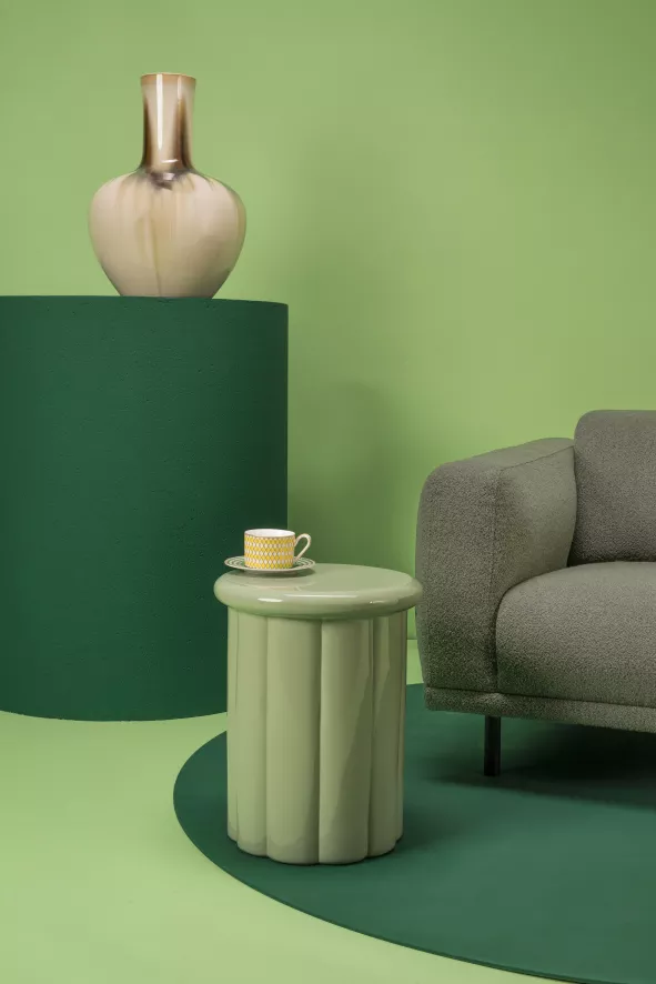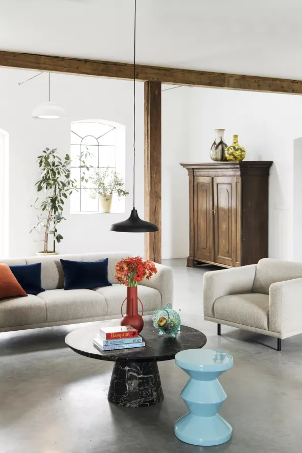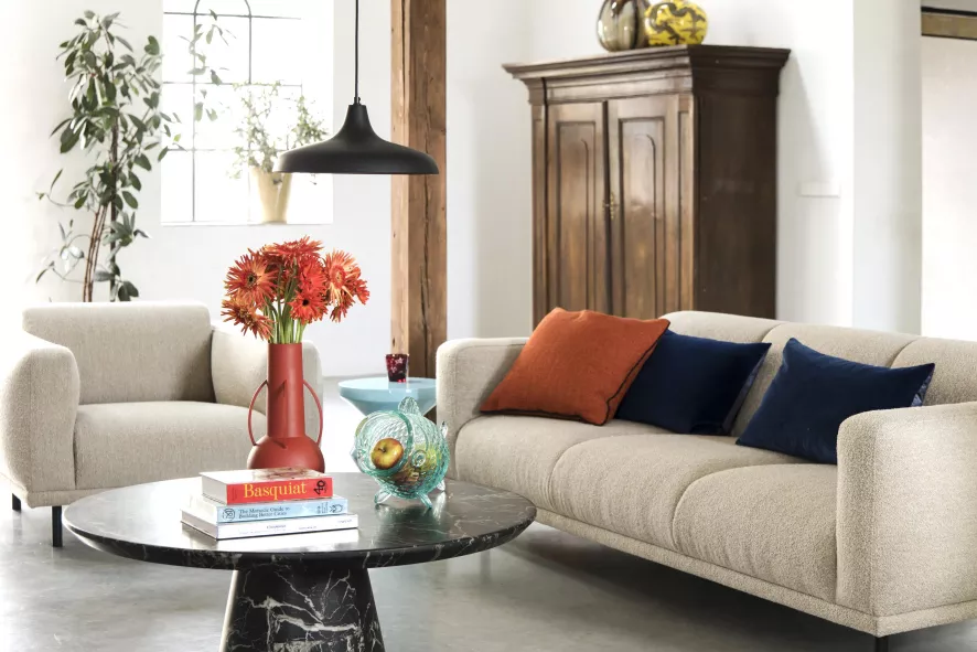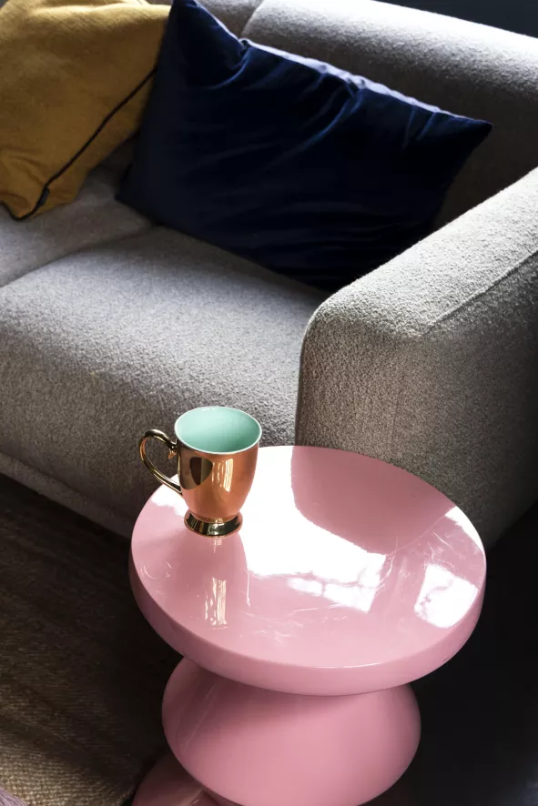 De Teddy 2-zits bank van pols potten heeft een breedte van 218 centimeter, een diepte van 92 centimeter en een hoogte van 71 centimeter. De zithoogte bedraagt 40 centimeter, de zitdiepte 60 centimeter en de hoogte van de armleuningen 60 centimeter. De stoffering van Teddy is van een zachte en behaaglijke bouclé stof en bestaat uit 96% polyester, 4% polyacryl en is FR cigarette proof. Het frame is van zwart gepoedercoat staal. De bank weegt 64,5 kilogram.