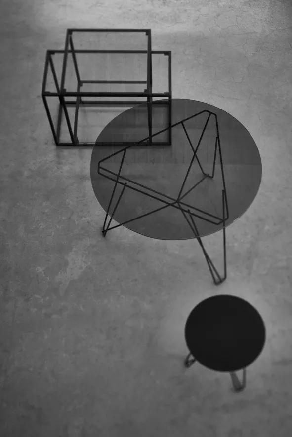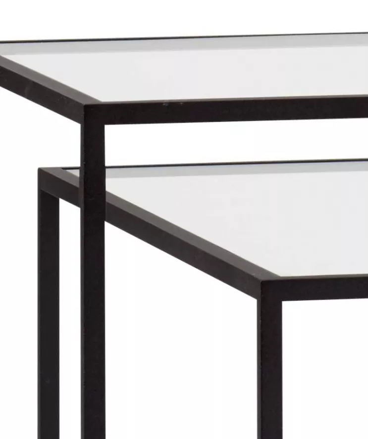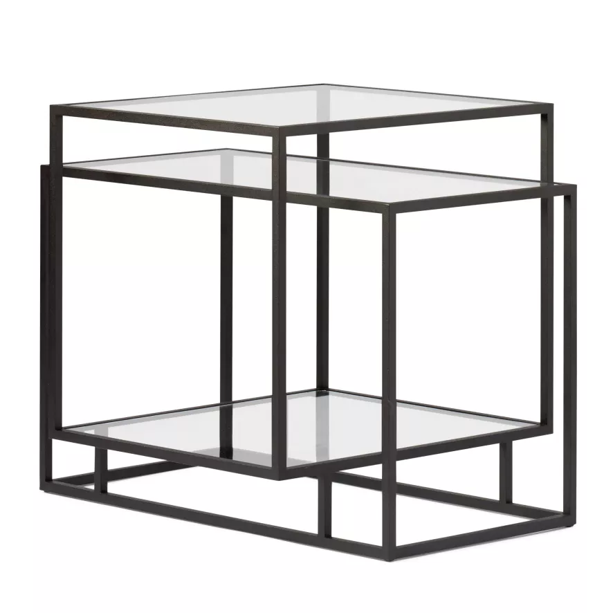 De Tangled bijzettafel van Spectrum heeft een breedte van 50 centimeter, een diepte van 38 centimeter en een totale hoogte van 40 centimeter. De tafel heeft een zwart geëpoxeerd, stalen frame en heeft drie glazen tafelbladen. De tafelbladen zijn verkrijgbaar in helder of gerookt glas.