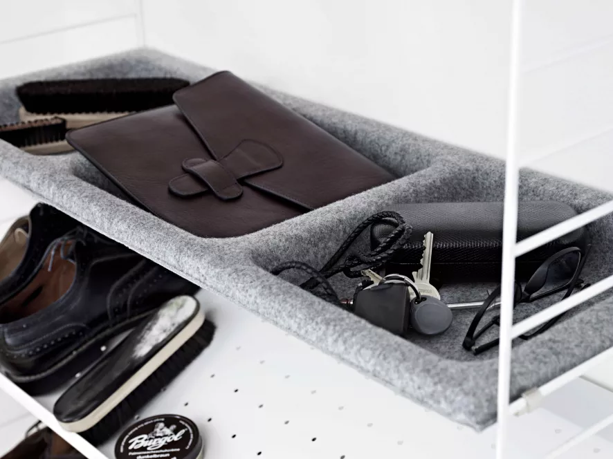 De Hoge kast 2 medium, grijs van String is een staande kast en heeft 3 ‘poten’ die van boven tot onder de kast lopen, en elk 200 centimeter lang en 30 centimeter diep zijn. Verder heeft de kast 2 ladekastjes, die 78 centimeter breed en 30 centimeter diep zijn. Beide kastjes hebben 2 lades. De kast heeft in totaal 8 planken die elk 78 centimeter breed en 30 centimeter diep zijn. 2 van die planken zijn bovendien gemaakt van vilt, en hebben ieder 3 open bakjes om kleine spullen in op te bergen, zoals je huissleutels of zonnebril.