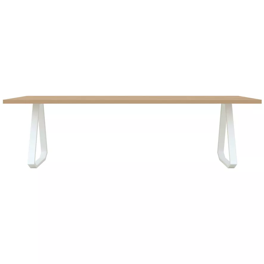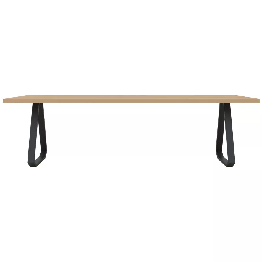 De Topple Tafel 220×90 van Studio HENK heeft een lengte van 220 centimeter, een breedte van 90 centimeter en een hoogte van 74 centimeter. Je kunt voor het stalen frame kiezen uit een witte of een zwarte poedercoating. Voor het tafelblad van eikenhout kan je kiezen uit een variant die behandeld is met hardwax naturel of een die behandeld is met een twee-componenten lak. De Topple tafel is ook in andere afmetingen verkrijgbaar.